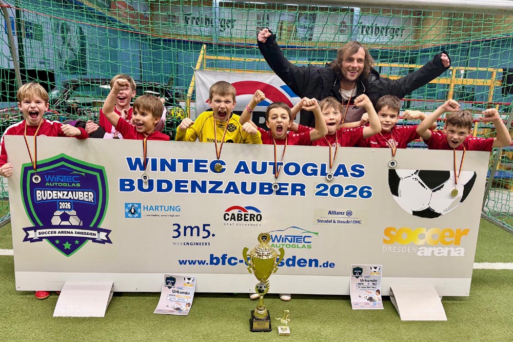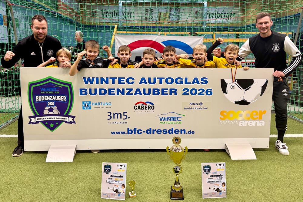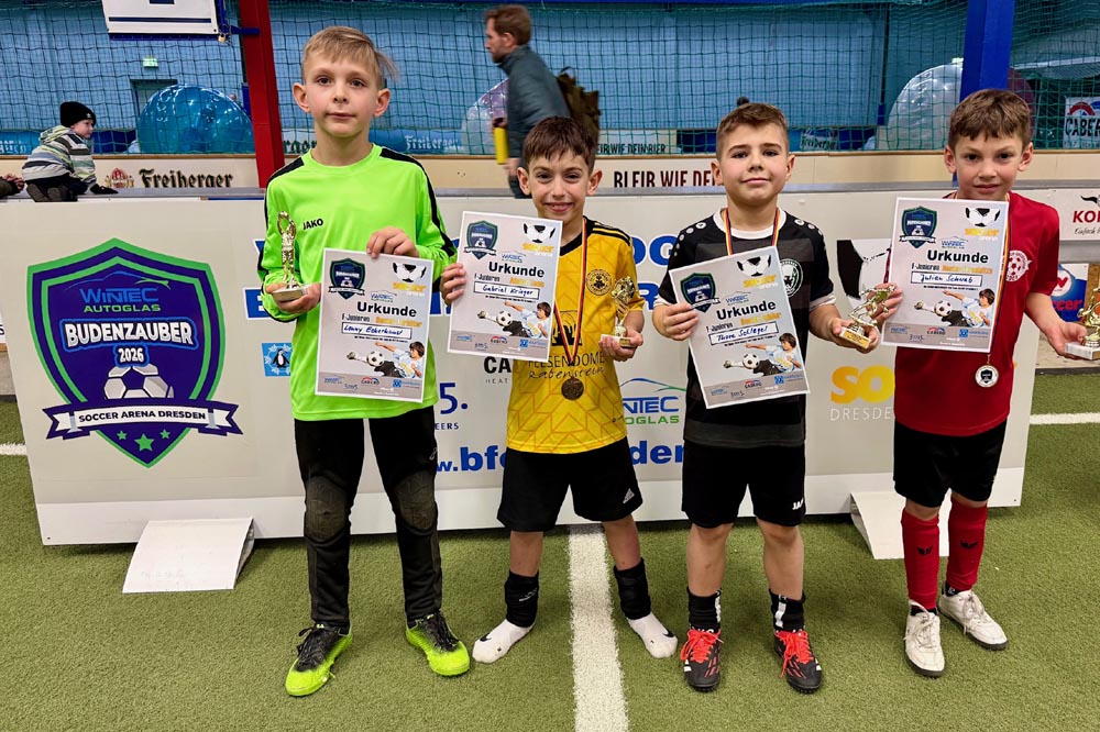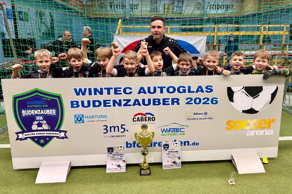 Das letzte Wochenende beim diesjährigen WINTEC Autoglas Budenzauber 2026 begann mit dem zweiten Turnier der F-Junioren. Pünktlich zum Turnierstart waren wieder 32 Teams aus den verschiedensten Regionen Ostdeutschlands angereist. Kein einziges Team kam Verlustpunktfrei durch die Vorrunde, was ein Fingerzeig auf ein sehr ausgeglichen besetztes Turnier war. Doch letztendlich standen im Halbfinale die vier besten Teams des Turniers, den sie zeigten in den vier verbleibenden Spielen um den Turniersieg besten Nachwuchsfußball mit Technik, Kampfgeist und Fairplay. Der Sieg ging nach Limbach-Oberfrohna! Der FSV hatte noch einige Probleme in der Vorrunde und setzte sich auch in den Überkreuzvergleichen alles andere als souverän durch. Aber die Leistung im Finale gegen die bärenstarken Jungs vom FV Preussen Eberswalde rechtfertigte dann endgültig den verdienten Turniersieg. Dritter wurde SG Handwerk Rabenstein, die sich ebenso knapp gegen das beste Dresdner Team von TSV Rotation Dresden durchsetzten.
