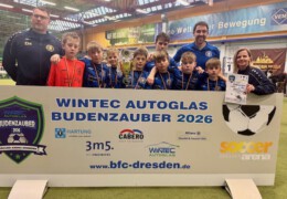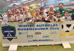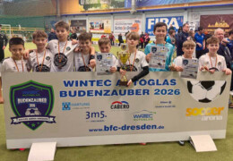 Drittes und letztes D-Junioren-Turnier wieder mit 32 Teams aus dem Osten Deutschlands. Die Teams aus Dresden und Umgebung hatten sich für diese Challenge viel vorgenommen und wollten den Siegerpokal diesmal unbedingt in der Region behalten. Aber die Talenteschmiede vom JFV Neuseenland hatte etwas dagegen und hielt sich nach einer blitzsauberen Vorrunde auch in den Überkreuzvergleichen schadlos. Im Finale trafen sie mit dem Radeberger SV 2 auf den härtesten Brocken des Turniers und es war ein herrlicher Fight auf Augenhöhe, der erst im Strafstoßschiessen die Rand-Leipziger als glückliche Sieger fand. Dritter wurde der Döbelner SC 1, die den besten Spieler und den besten Torhüter des Turnieres stellten.
