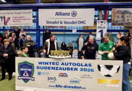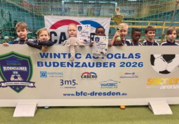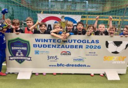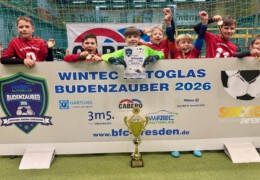 Endlich war es auch für die jüngsten Jahrgänge soweit, in den diesjährigen WINTEC Autoglas Budenzauber zu starten. Und beim ersten Turnier der F-Junioren wurde dann auch aus allen Rohren geschossen. Sage und schreibe 623 mal schlug der Ball bei 148 Turnierspielen im gegnerischen Gehäuse ein. So viel wie bei keinem anderen diesjährigen Turnier vorher. Bei einem sehr gut besetzten Turnier mit einigen Teams aus Berlin, dem VfL Halle 96, dem 1. SC Göttingen 05, dem FC Thüringen Jena und nicht zuletzt RB Leipzig blieb der größte Pokal am Ende in der sächsischen Landeshauptstadt. Die SG Dresden Striesen steigerte sich von Spiel zu Spiel in einen wahren Rausch und war nach der glücklichen Quali in der Vorrunde, wo sie nur über das bessere Torverhältnis weiterkamen, in den Finalspielen nicht mehr zu schlagen. Platz 2 belegten die starken Kicker vom FC Thüringen Jena vor dem VfL Halle 96, die mit ihrem super Jahrgang, der schon 2025 für Furore gesorgt hatte, angereist waren. Die Hallenser waren es auch, die das spielerisch sicherlich stärkste Team von RB Leipzig im Viertelfinale mit 3:1 besiegt hatten. Bemerkenswert war auch das Abschneiden des SV Helios 24 Dresden, die in diesem Feld einen hervorragenden vierten Platz belegten.