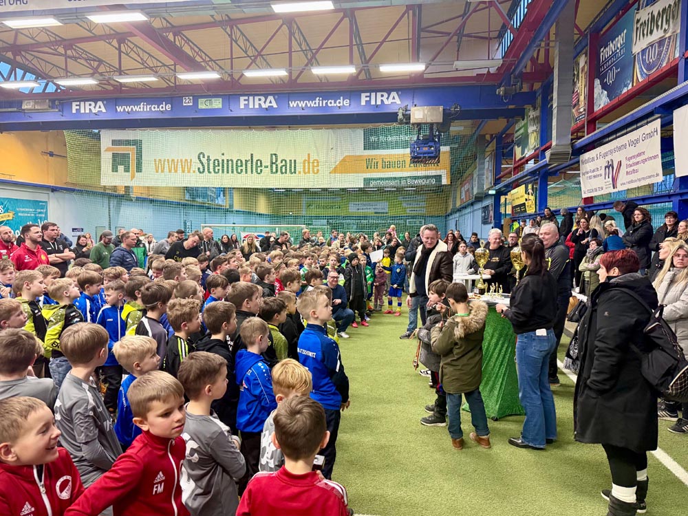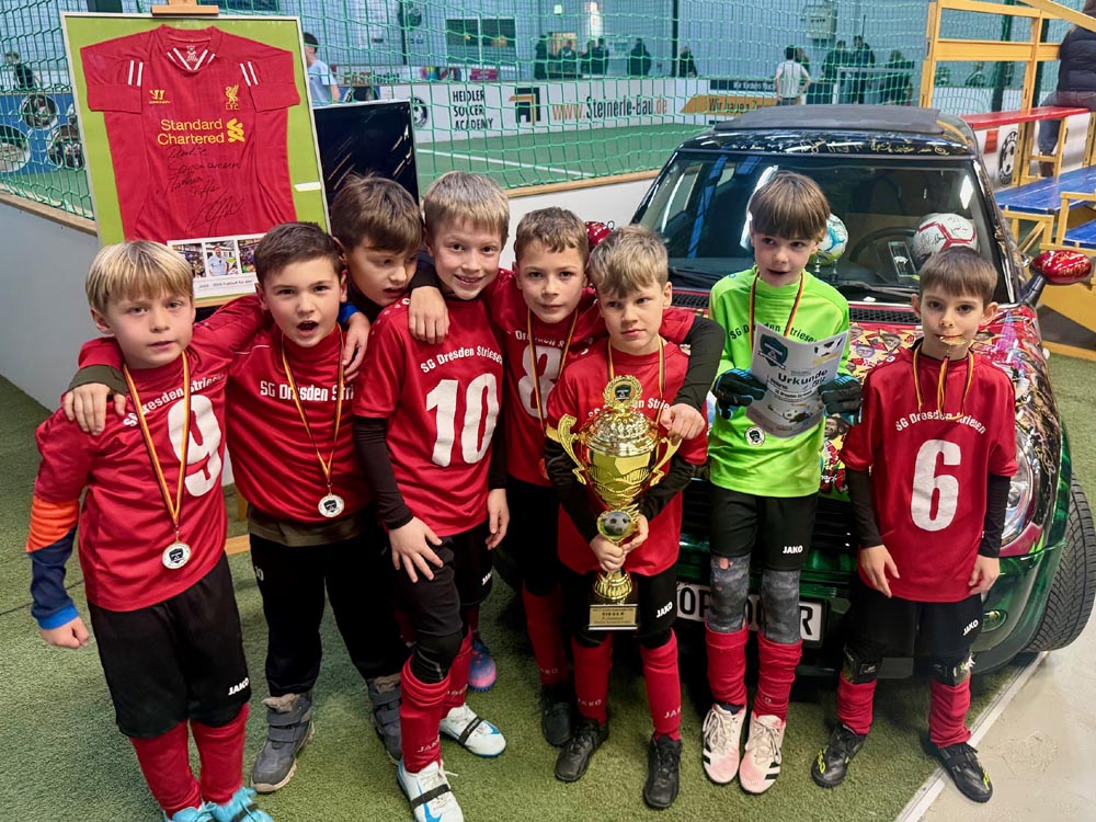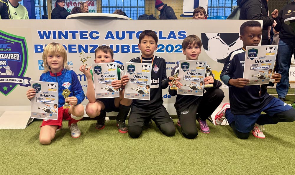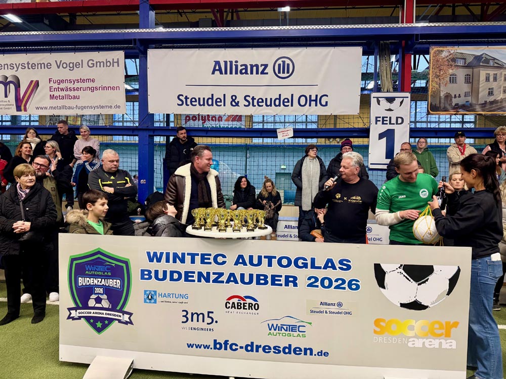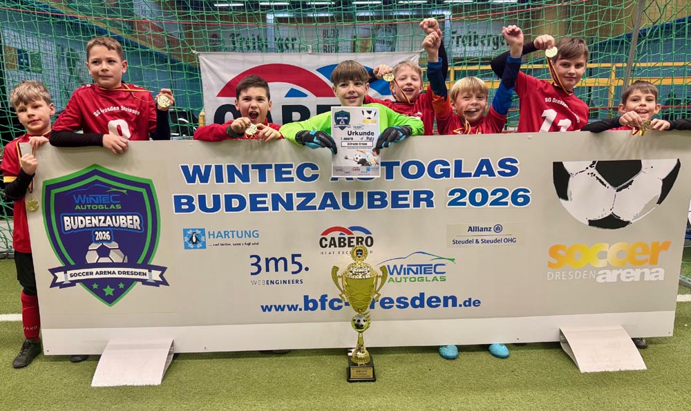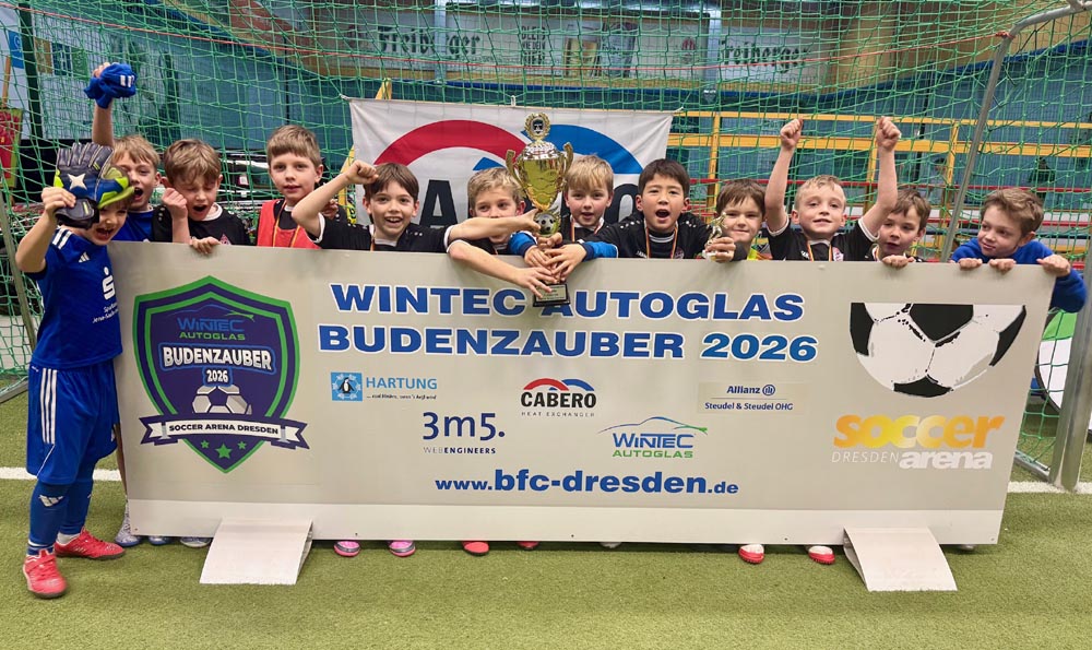 Endlich war es auch für die jüngsten Jahrgänge soweit, in den diesjährigen WINTEC Autoglas Budenzauber zu starten. Und beim ersten Turnier der F-Junioren wurde dann auch aus allen Rohren geschossen. Sage und schreibe 623 mal schlug der Ball bei 148 Turnierspielen im gegnerischen Gehäuse ein. So viel wie bei keinem anderen diesjährigen Turnier vorher. Bei einem sehr gut besetzten Turnier mit einigen Teams aus Berlin, dem VfL Halle 96, dem 1. SC Göttingen 05, dem FC Thüringen Jena und nicht zuletzt RB Leipzig blieb der größte Pokal am Ende in der sächsischen Landeshauptstadt. Die SG Dresden Striesen steigerte sich von Spiel zu Spiel in einen wahren Rausch und war nach der glücklichen Quali in der Vorrunde, wo sie nur über das bessere Torverhältnis weiterkamen, in den Finalspielen nicht mehr zu schlagen. Platz 2 belegten die starken Kicker vom FC Thüringen Jena vor dem VfL Halle 96, die mit ihrem super Jahrgang, der schon 2025 für Furore gesorgt hatte, angereist waren. Die Hallenser waren es auch, die das spielerisch sicherlich stärkste Team von RB Leipzig im Viertelfinale mit 3:1 besiegt hatten. Bemerkenswert war auch das Abschneiden des SV Helios 24 Dresden, die in diesem Feld einen hervorragenden vierten Platz belegten.